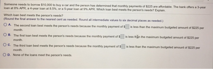 A commercial bank will loan you $7,500 for two years to buy a car. The loan must be repaid in 24 equal monthly payments. The annual interest rate on the loan is 12% of the unpaid balance. ... Read Here